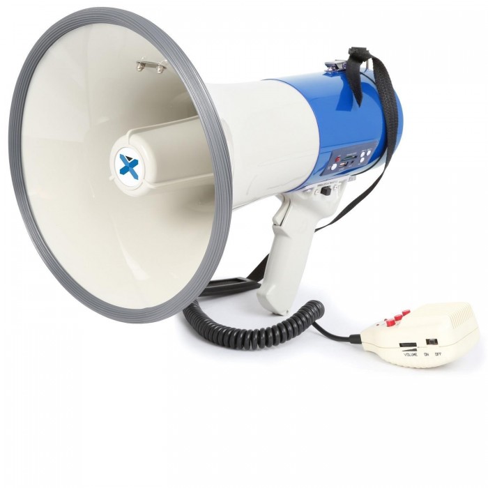 Mégaphone puissance avec port USB, insert SD, batterie Lithium, panneau de commande MP3, amplificateur 65 W intégré et microphone amovible avec cordon spiralé. Avec réglage de volume, sirène et bandoulière réglable. Portée de 1,0 - 1,2km selon les conditions d'utilisation.