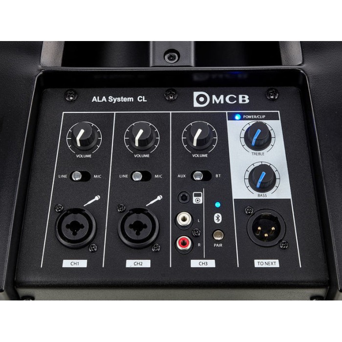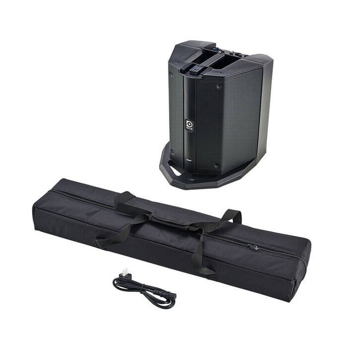 Avec caisson de basses 8" et enceinte colonne avec 6x haut-parleurs 2,75" dans la partie supérieure